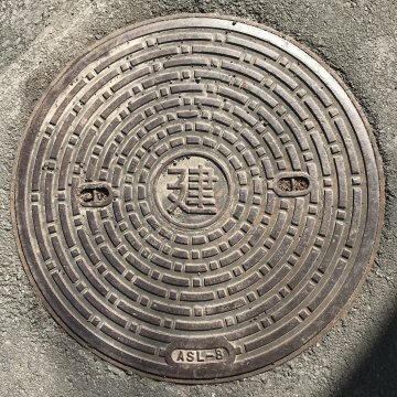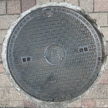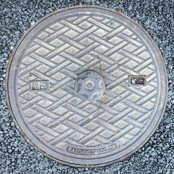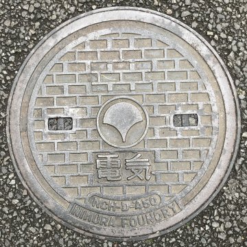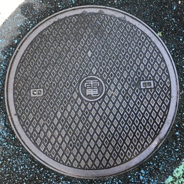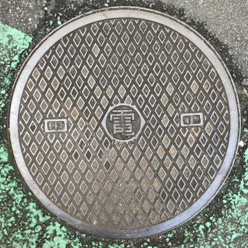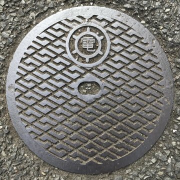 「電」などの文字が入っていないが、近くに街路灯が見られたことから、電気蓋と認定した。一中(ICCHU いっちゅう)の製品で、奇妙な模様である。 |