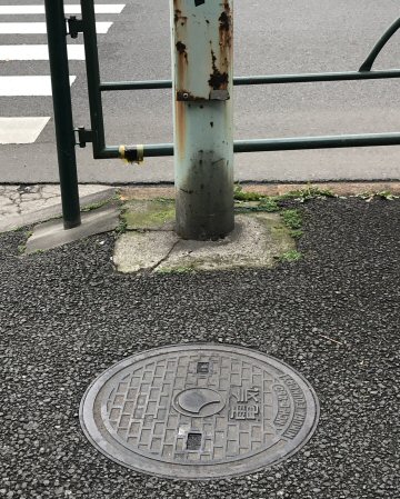 街路灯支柱と丸電鉄蓋(都道)