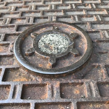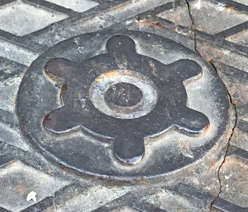 これもしばしば見かける蜘蛛の巣模様の鉄蓋である。なぜガス抜きの穴があるのかは不明である。 |