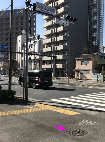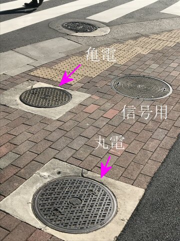 交差点付近の亀電鉄蓋と丸電鉄蓋(都道)