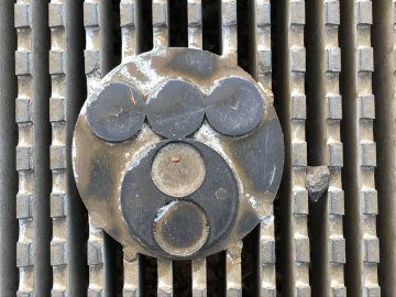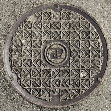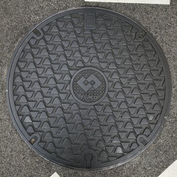 現在でもよく目にする波型模様の古い鉄蓋である。シンボルマークは「カミナリ+T」とされる。 |