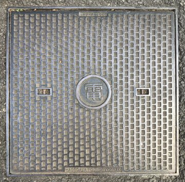 弱電鉄蓋の付近に、幸い強電鉄蓋があった。業界の区分による仕分けのようである。 |