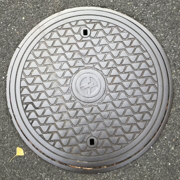 マンホール商会扱いのよく目にするH字模様の汎用品の丸電鉄蓋である。 |