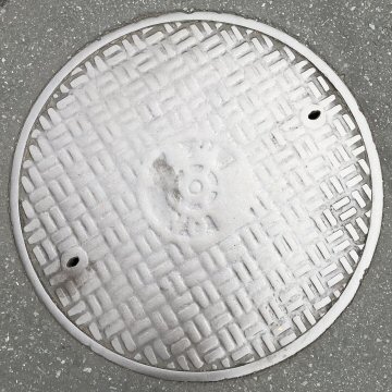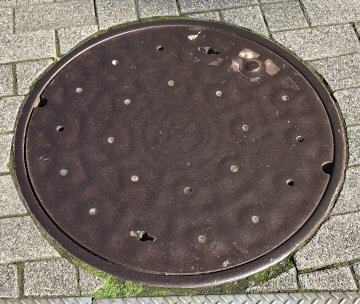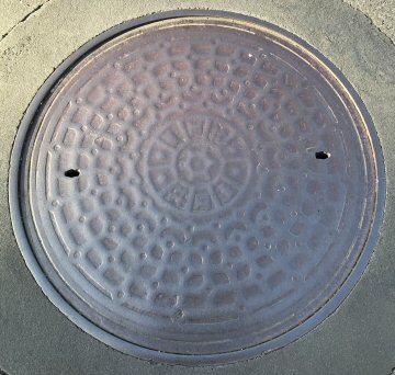 下水道の蓋は謙虚であるから、点字ブロックは躊躇なく蹂躙している。種別表示も見えなくなっている。 |