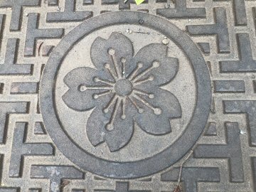 山手通り、中目黒の歩道脇で見られたものであるが、このあたりは目K川を隔てて自衛隊の関連施設が多数存在し、たぶん関係の一般通信用施設の鉄蓋と推定した。T字の地紋に桜花紋のある鉄蓋は、自衛隊の基地内ではふつうに見られるという。 |