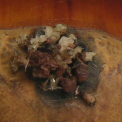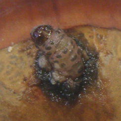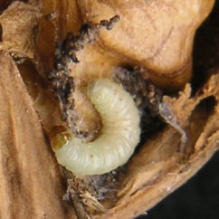 (2) | クリの場合 クリの場合は、生活に密着した食品となっていることから、非常に情報が多い。生のクリの場合は専らクリシギゾウムシの幼虫が主たる犯人であるというのが定説である。加えてクリミガの幼虫も活躍しているようである。いずれもクリ虫の名前で広く知られている。(特に前者の成虫は一部で親しまれている。) |