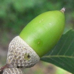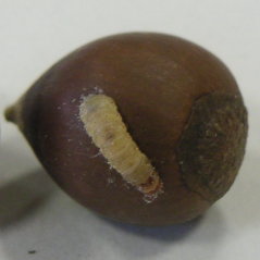 <おまけ2:ドングリが大好きな虫たち> ドングリもクリと同様に、いろいろな幼虫にとっては豊かな食べ物となっているようである。やはり、樹上で卵を産み付けられるようである。 |