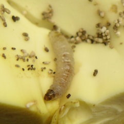 上記書籍の掲載写真と比較すると、主たる犯人はやはりノシメマダラメイガであることが判明した。しかし、これとは異なると思われる蛾が2種類存在していることを確認した。このうちの1種はイッテンコクガであることを確認した。しかし、このような展開となると、幼虫について種類を同定することが困難となってしまった。 以下はこれらの写真である。 |