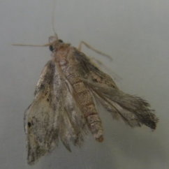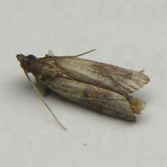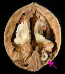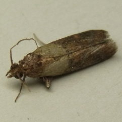 (1) | クルミの場合 幼虫がうごめくクルミもろとも(割って生息を確認したもの)チャック付きのポリ袋に納めて、成虫になるまで放置することとした。途中、驚くことに幼虫がポリ袋を食い破って徘徊しているのを発見したことから、穴をふさぎ、二重の袋とした。食害されたクルミをチャック付きのポリ袋に納めて、幼虫が成虫になるまで放置することとした。 幸いにして、ある日、袋の中でパタパタやっていた小さな蛾(ガ)を観察することができた。 そこで、シナノクルミを購入した長野県内の販売業者に聞いたところ、クルミは梅雨時を過ぎるとひどくやられることがあるが、虫の名前についてはわからないとのことであった。そこで、長野県果樹試験場に成虫の写真を添えて照会したところ、「ノシメマダラメイガ」であろうとの回答をいただいた。 |