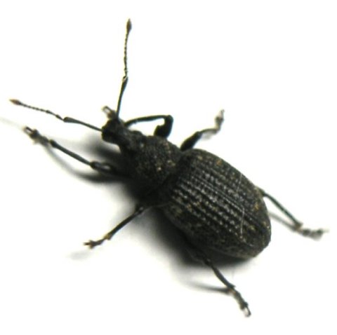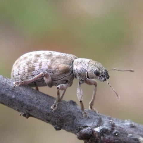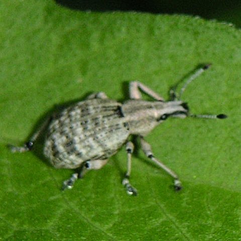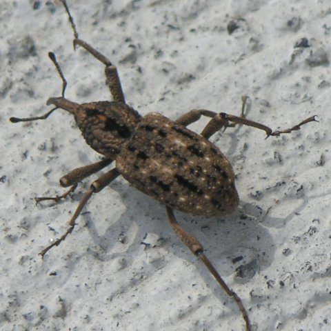 <おまけ1:ゾウムシの仲間たち> クリの木についたほとんどの実に卵を産み付けると言われるクリシギゾウムシであるが、いろいろな時期に栗の木を観察したものの、残念ながらそのユニークな姿を確認することができなかった。クリシギゾウムシのお母さんは随分働き者に違いないから、額に汗しながら忙しく卵を産み付けている姿を是非見たかったのであるが、これが叶わなかったため、代替として以下にその仲間たちに登場願うこととする。 |