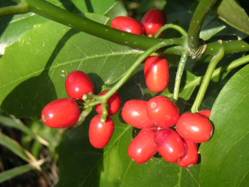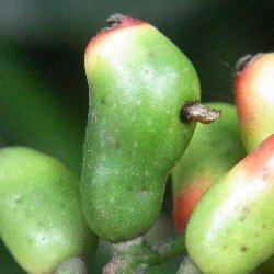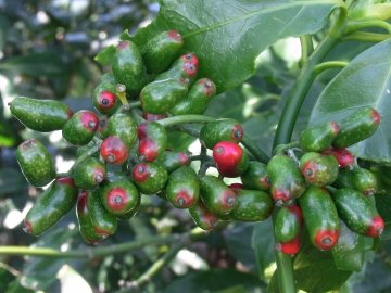 アオキの「虫こぶ(虫えい)」とされているものは単に果実の形が少しゆがんでいたり、赤と緑のツートンカラーになっているだけで、形態的には全く面白味がない。