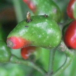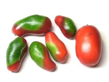 多くは赤と緑のツートンカラーのゆがんだ形態となっている。右端の果実は比較用の正常な果実である。 |