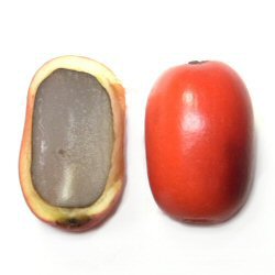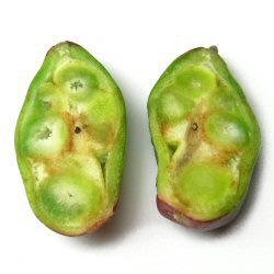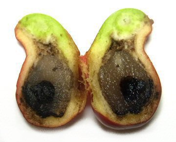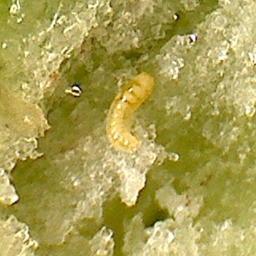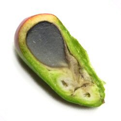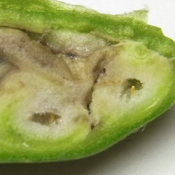 幼虫を探索するためには、怪しい果実を見当を付けてザックリ切ってみる必要があるが、必ずしも幼虫の虫室に当たるとは限らず、一方、大当たりで幼虫を惨殺する可能性もある。 |