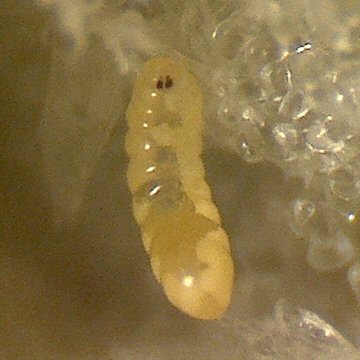 幼虫のまわりの透明なぶどう状の組織は、ひょっとすると幼虫が果実を操作してつくらせた自分専用の特製の食べ物であろうか? なぜか汚い糞も見られない。 |