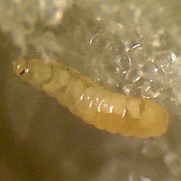 写真で見られる2つの虫室にはそれぞれ1匹の黄色い幼虫が確認できる。 |