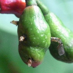アオキミフクレフシやエゴノキミフシの場合、タマバエが寄生すると、果実の発育が途中で停止し、正常の大きさに達しないが、これもゴールと呼ばれる。 |