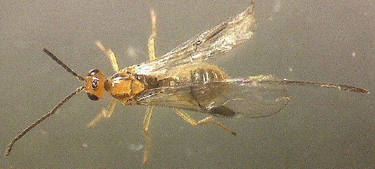 | アオキミタマバエの寄生バチ(♀ 腹面) |
