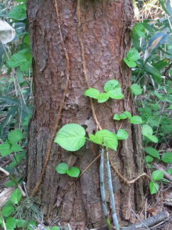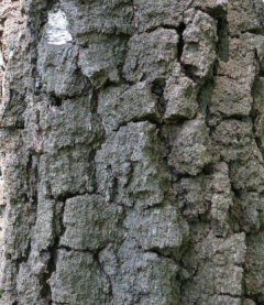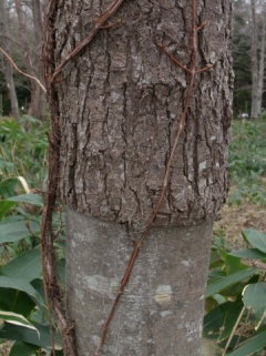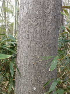 | 一般的に木々の樹皮は年数を重ねるにつれて次第に表面の質感が粗くなり、さらに様々な形態で割れが生じたり、剥がれ落ちたりするなど、外観が変化する樹種が多い。もちろん、ブナのように大径木となっても樹皮が平滑なままのものもや、ヤブツバキのように樹の太さに係わらす表面の微細な縮緬模様を維持するものなどもあるが、樹皮に変化の見られる樹種にあっては、目の届く範囲は概ね均質な印象である。しかし、まれに樹幹の下部が長い年数を経過したように粗くなっているにもかかわらず、上を見上げるとツルッとした若木のような樹皮を持った樹が存在し、まるで下方と上方にかなりの時間差があるかのように見える奇妙な変わり者が存在する。【2012.6】 |