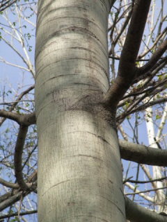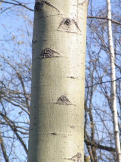 | @〜Cは、ヤナギ科ヤマナラシ属(Populus 属)に分類されている樹木たちである。セイヨハコヤナギや改良ポプラとは雰囲気が異なっていて、成木の樹皮を見ると、下部を見れば暗色でゴツゴツと粗く割れているのに対して、見上げれば、中央以上の樹皮は面白いことにツルッとした肌にしばしば特徴的な菱形の皮目が点在している。 |