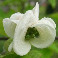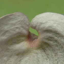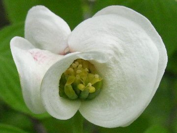 開花時期を迎えた際に、4個の総苞片の先端部がくっついたタイプでは中央線部分の成長が遅くてもたもたしていて、その間にじらされた個々の総苞片の両翼部分が縦方向及び両翼方向にはるかに伸長し、結果として個性的な三次元構造に至るようである。 |
