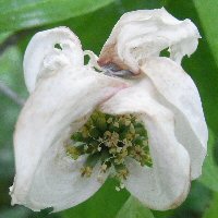 ハナミズキの総苞片の形態に関して、同属近縁のヤマボウシの総苞片の場合と比較して、しばしば先端部が凹んでいると表現されている。しかし、これは正確ではなく、先端部は間違いなく尖っている。ただ、尖った先端部は下方に反り返ってるというのが真相である。この奇妙な形態については表現は難しく、また、なぜこんなことになっているのかもあとで検討してみたい。 |