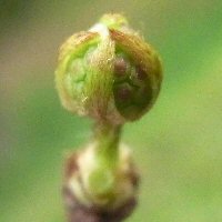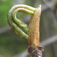 芽鱗から丸まった状態で先端が引っ掛かった対生する葉が伸び出ている。 |