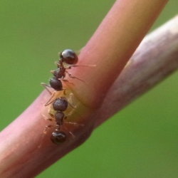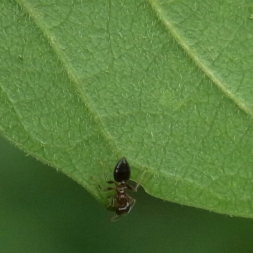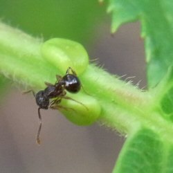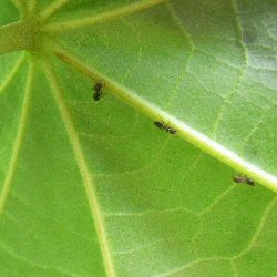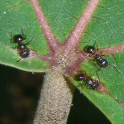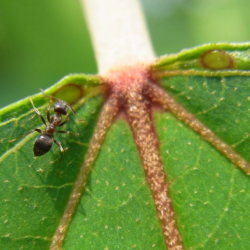街路樹の下の実生幼木の葉裏で、中央脈の基部付近にアリが取り付いているのを確認した。(7月中旬) |