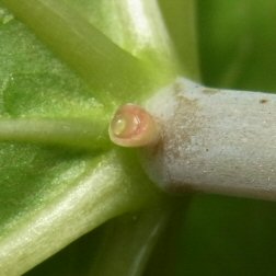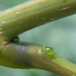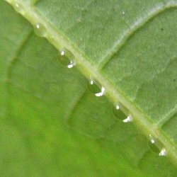 植木鉢の実生アオギリの葉裏の中央脈の基部付近で見られたもので、間違いなく蜜であった。単に細胞の内圧調整で排出しているのかも知れないが、不明である。(7月上旬) |