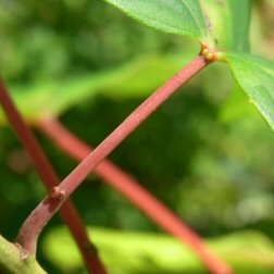 葉柄の上部に紅色の杯型の蜜腺が2つある。(5月上旬) |