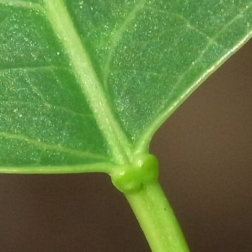 大きめの蜜腺が葉身の基部又は葉柄の上部に2つある。蜜が出ている。