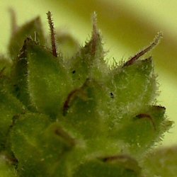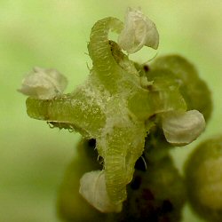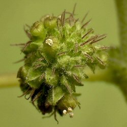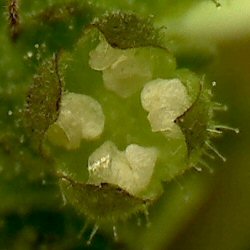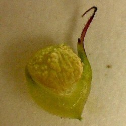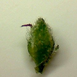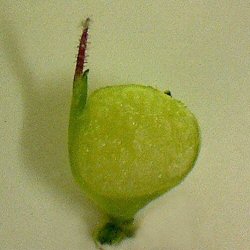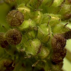 なお、一般に「雌花の花柱は子房の側方につく」として説明されるが、この形態の由来は、くちばし状に肥厚した外果皮の片方に花柱がつながっていることによるものと理解できる。この花柱はそう果が成熟し・放出される時点でも残存する。 |