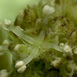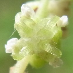 上のカラムシの写真でも伸びきった花糸で横じわは確認できるが、どういったきっかけで圧力が開放されるのかは見てもよくわからない。ただ、花はシンプルな構造であるから、弾けようとする花糸は閉じた花被片に抑えられていて、花被片が少々緩んだときにバランスが崩れて雄しべが弾き出るものと思われる。