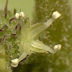 受粉時期の雌花は雄花よりも小振りでわかりにくいが、紅紫色の花柱でその存在を確認できる。白く見えるのが雄花の雄しべで、まだ伸びきっていない。 |
