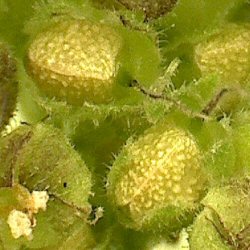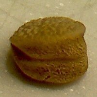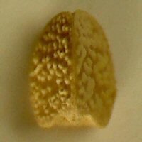 | そう果の長さ1.1±0.1mm、幅0.9±0.0mm、厚さ0.8±0.1mm。そう果は広卵状3稜形、基部は切形。背腹両面は3角形。3稜形の2側面にはいぼ状の低い突起が散生し、残りの側面には浅い1縦溝が通る。そう果は灰黒色地に灰色斑紋(いぼ状隆起)、縦溝は灰黒色、光沢はない。(日本植物種子図鑑) |