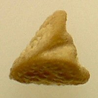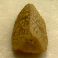 果柄の反対側から見た様子で、おおよその3稜形であることが確認できる。 |