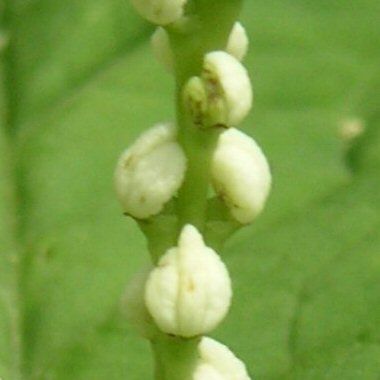 花穂は茎の先に直立し6-7月頃黄緑色の小さい裸花をつける。雄ずいは1個で子房に合生。 |