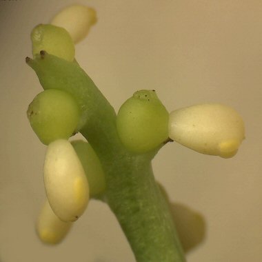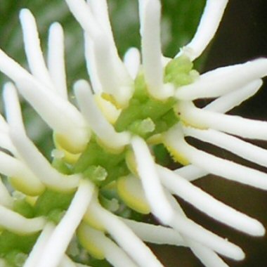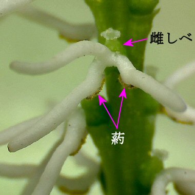 これも変わり者で、花弁も萼もない花が花穂をつくっている。何気なく見ていた白い棒状のものは雄しべの花糸とされ、各子房の背軸面に3個の雄しべがついていて、うち中心の雄しべには葯がなく、両側の雄しべの基部外側に黄色い葯が見える。子房の頂部に雌しべの柱頭が見える。、 |