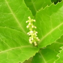 (旧版:夏日頂に短き複穂状花序を着け二三分岐し無柄の黄緑細花あり。裸花にして花被なく、雄しべ一箇にして分岐せず子房外壁に沿着す。) |