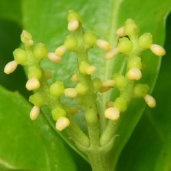 花は両生。6〜7月、枝先に小さな花が集まってつく。花には花弁も萼もなく、子房の横に雄しべが1個つく。 |