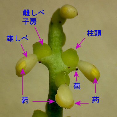 調べてみれば、これは奇妙な形態の花序であることがわかった。この花は花被を持たず、1個の雌しべとこれにしがみついた1個の雄しべで構成されているという、あまりにも簡素な驚くべき個性の持ち主であることがわかった。 |