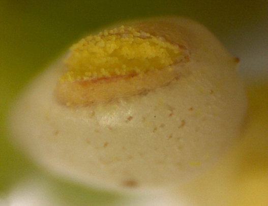 こちらはデザインがガラリと変わっている。白い帽子状のものは3個の花糸とされ、内側に雌しべが納まっている。葯も内側に納まっていて、中央の雄しべには葯が2個、両側の雄しべには1個ずつ葯がある。