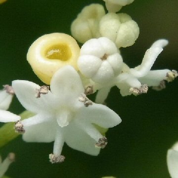 ニワトコはソクズと同様ガマズミ科ニワトコ属で、花もよく似ているが、雌しべの柱頭が暗紫色である点が異なる。 |