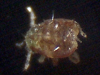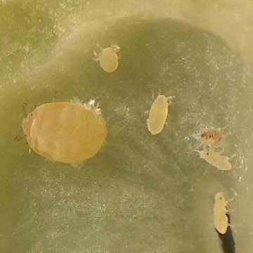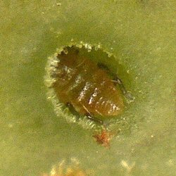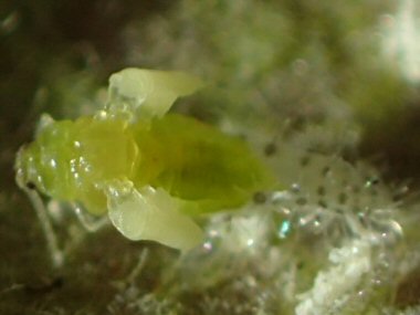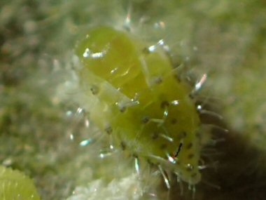 すくすくと育って、体長は1ミリほどになっている。体の表面に見られる毛状のものは、透明なガラス管状の形態となっている。余分な体液を蒸散させる役割があるのかは未確認。コナラの葉裏で見られる幼虫と似ているが、こちらは無翅型である。雌雄は不明。 |