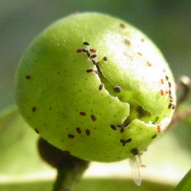 イスノキの虫えいについては種類が多く、ふだんはその一部しか目にすることがなく、ごく一般的な存在であるイスノキハタマフシの印象が特に強い。このため、虫えいから有翅虫が脱出する時期については夏がふつうという思い込みがあったが、イスノキエダコタマフシのイスノタマフシアブラムシ Monzenia globuli の場合は、秋に有翅虫が脱出することを最近知った。しかも、このアブラムシは前記のヤノイスアブラムシのように寄主転換はせず、周年イスノキで生活するという。日本原色虫えい図鑑ほかによれば、イスノキエダコタマフシ及びイスノタマフシアブラムシの生態は以下のとおりである。 |