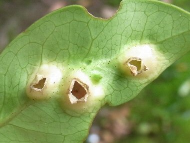 左の写真の葉裏の様子で、虫えいの尖った頂部が裂開して、空っぽである。