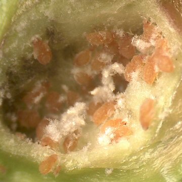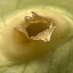 頂部に毛が残っているが、完全閉鎖されている。この部分は中で繁殖した有翅胎生雌虫の脱出口となる。 |