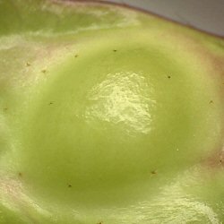 周囲が毛で覆われていた孔は葉の肉質の組織により完全に閉鎖されている。中の幹母はこの段階では裏側の膨らみの内側に鎮座していることが多かった。 |