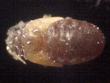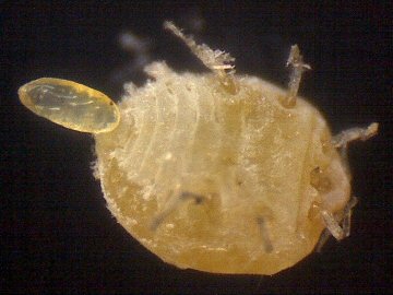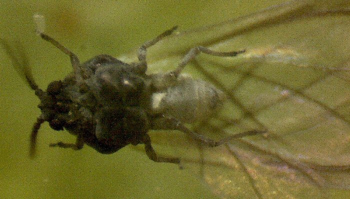 微小な幼虫を産み落とした有翅産性虫(腹側)