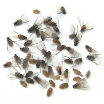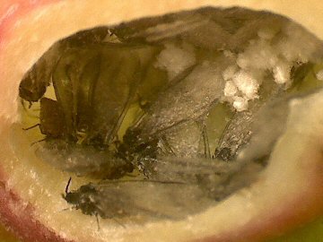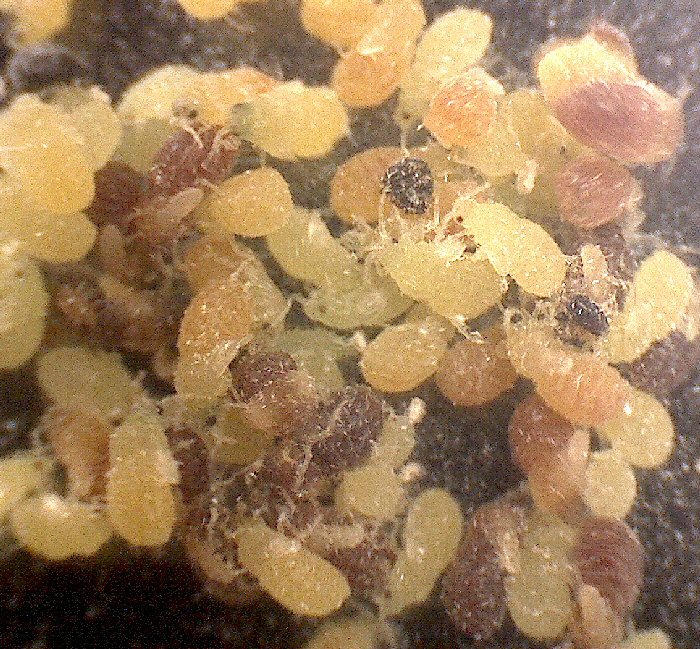| 1個のイスノキエダコタマフシを割って取りだしたイスノタマフシアブラムシの有翅産性虫の集団 虫えいを冷凍状態にして割ったものである。そうでもしなければ、翅を持ったアブラムシが室内で拡散してとんでもないことになる。わずかに幼虫が見られる。(11月上旬) |