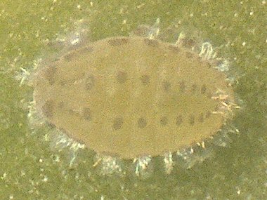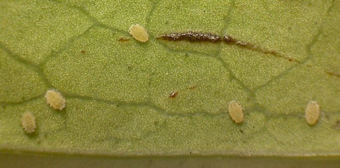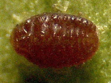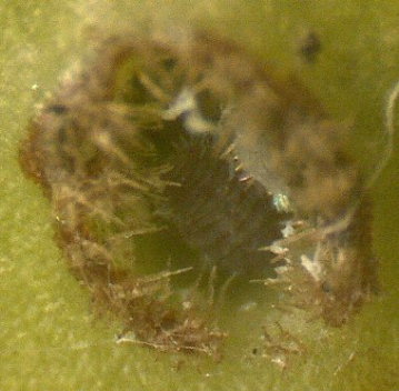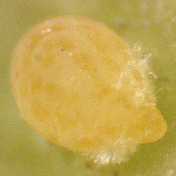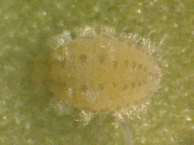 有翅産性虫がイスノキの葉裏に産下した幼虫?(腹側) |